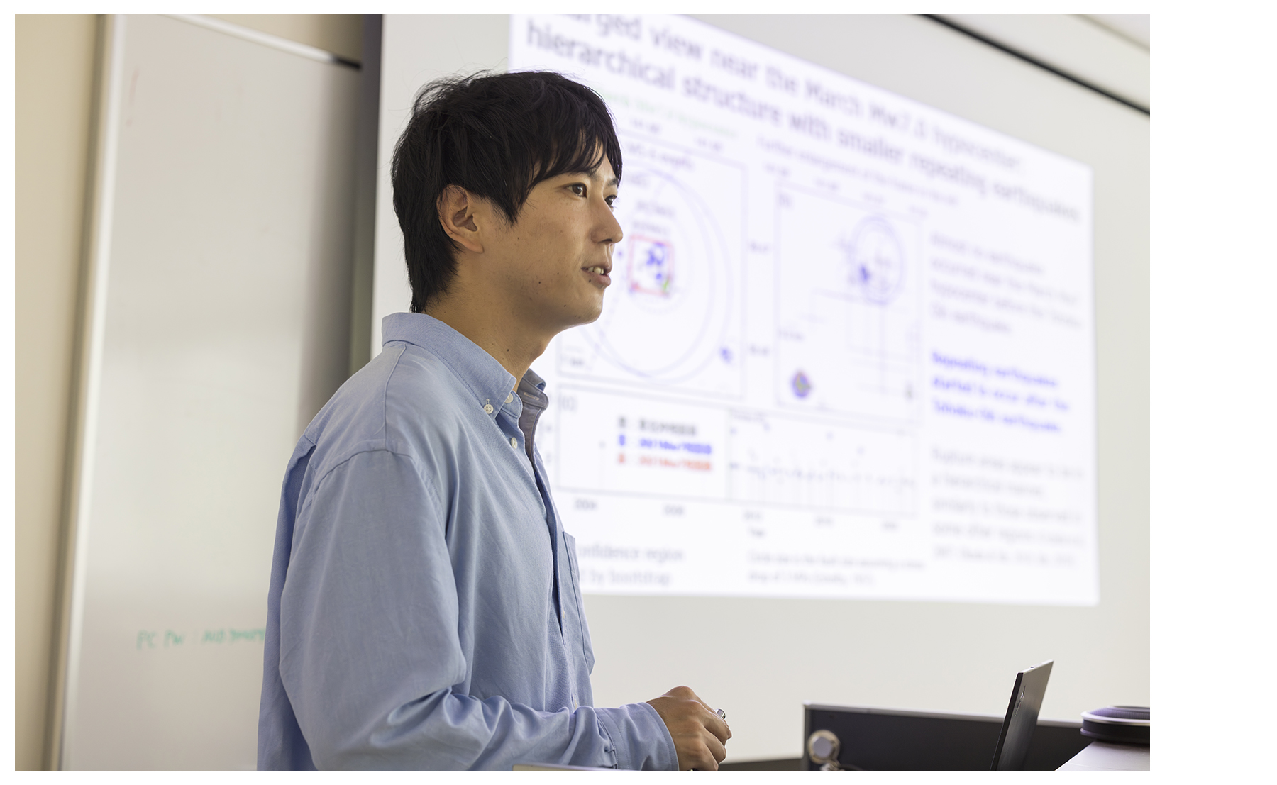 地震の発生過程に興味を持つようになったきっかけは、高校3年生と大学3年生のときに出身地の近くで起こった2004年新潟県中越地震と2007年新潟県中越沖地震でした。その後、2011年東北地方太平洋沖地震とそれに引き起こされた誘発地震群の研究に携わる中で、地殻応力や断層強度地殻流体の状態を明らかにすることの重要性を強く実感し、現在の研究につながっています。さらに、2021年に宮城県沖合で発生したM7.0地震を調べる中で、数少ない「再現性」をもつ地震現象である繰り返し地震の中に見られる不規則性に興味を持ち、その不規則性を利用して情報を抽出することに特に関心を持って研究を進めています。