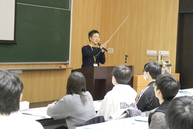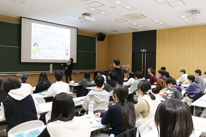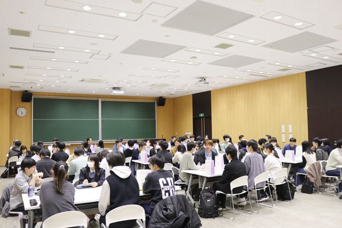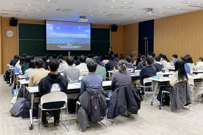 2026年3月20日(金・祝)理学研究科合同C棟 青葉サイエンスホールにて、「ぶらりがく for ハイスクール with JpGU」を開催しました。ぶらりがく for ハイスクールは、高校生を対象に、専門的な講義や交流会をとおして、東北大学理学部・理学研究科が推進している世界最先端の理学研究に深く触れていただくことを目的としたイベントです。今回は、日本地球惑星科学連合(JpGU)との共催で実施しました。当日は、東北大学から阿蘇愛理助教、中川広務准教授、JpGUから後藤和久教授(東京大学)による3つの模擬講義と、研究者や東北大学理学部・理学研究科に在籍している学生との交流会、また希望者20名(先着申込順)を対象に居室見学を行いました。三連休初日の午後開催ということで全国から中高生57名にご参加いただき、盛況のうちに終了いたしました。アンケートでは、「"三角形の内角の和が180度ではない世界"とはどういうことか、講義を聞いて理解を深めることができた」「理学と神話が結びつくイメージがなかったので、とてもおもしろかった」「以前からMMXに興味があったが、それでも初めて聞くことが多く、さらにワクワクした」「交流会では自分が気になっていることを質問でき、同じグループの参加者とも情報交換ができて、とても有意義だった」などの感想をいただきました。