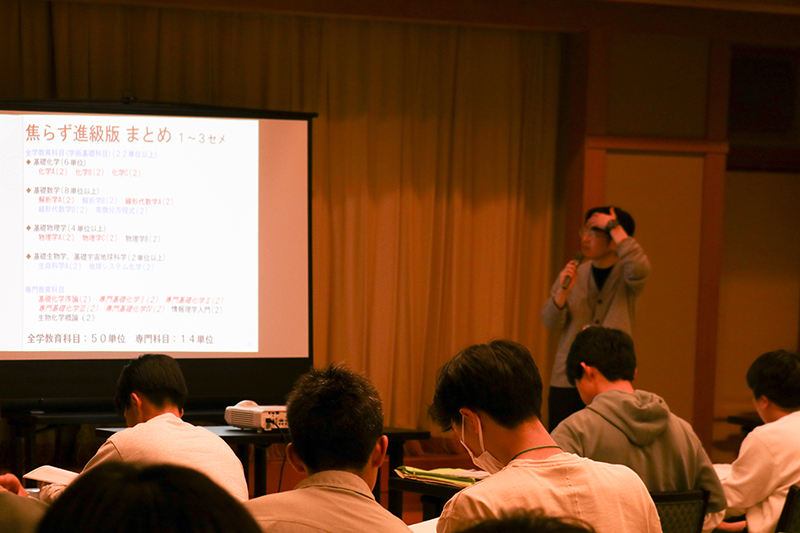理学部にて全体オリエンテーションと写真撮影を行った後、数学系は理学部、物理系・化学系・地球科学系・生物系は一泊二日の日程で、南三陸ホテル観洋にてガイダンスを行いました。新入生・教員・協力学生を合わせた約330名が参加しました。